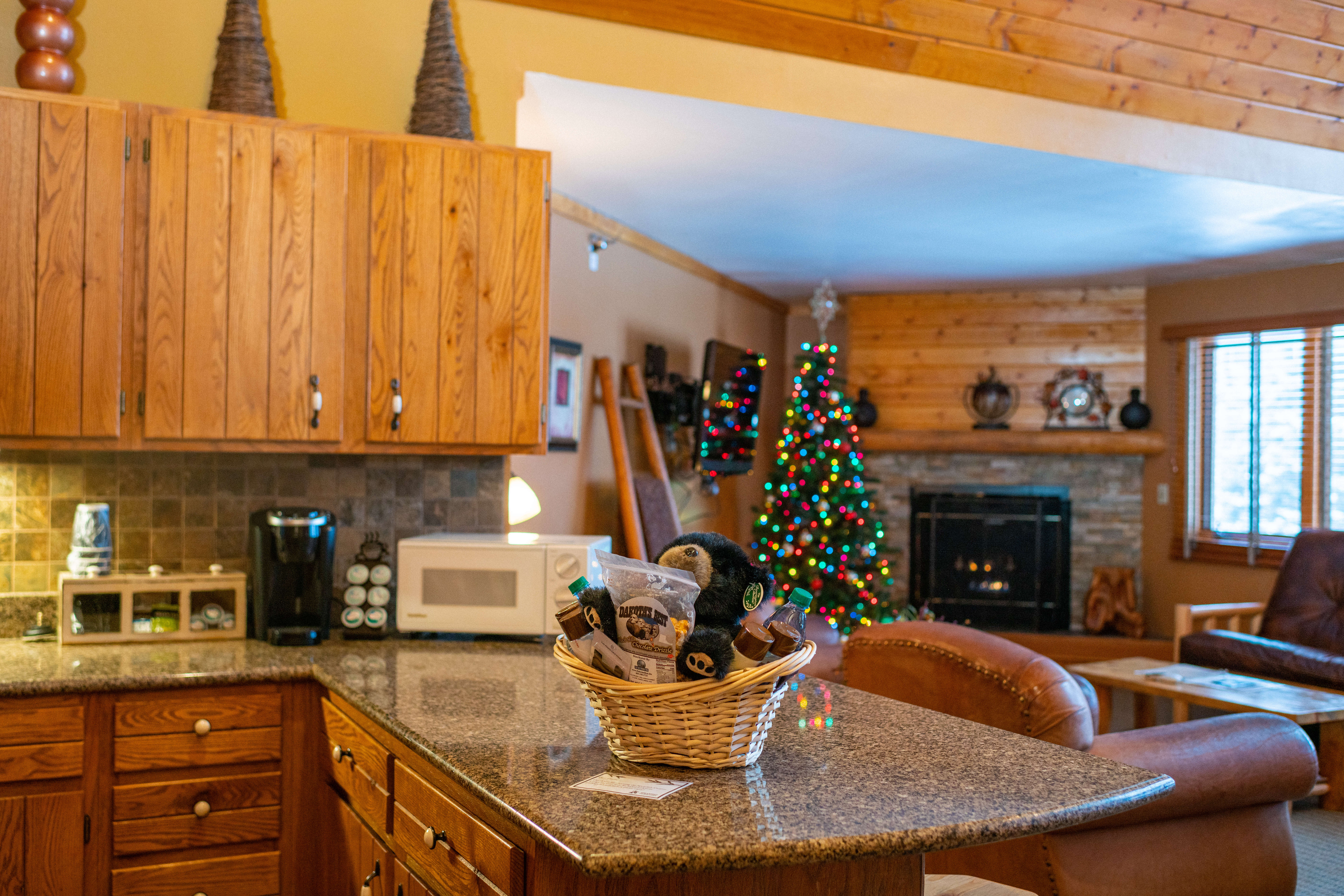 With a large kitchenette, including a full fridge and a sumptuous living room with leather seating set next to the cozy gas fireplace, this suite is the perfect fit for just the two of you in the evening and as much company as you’d like during the day.
