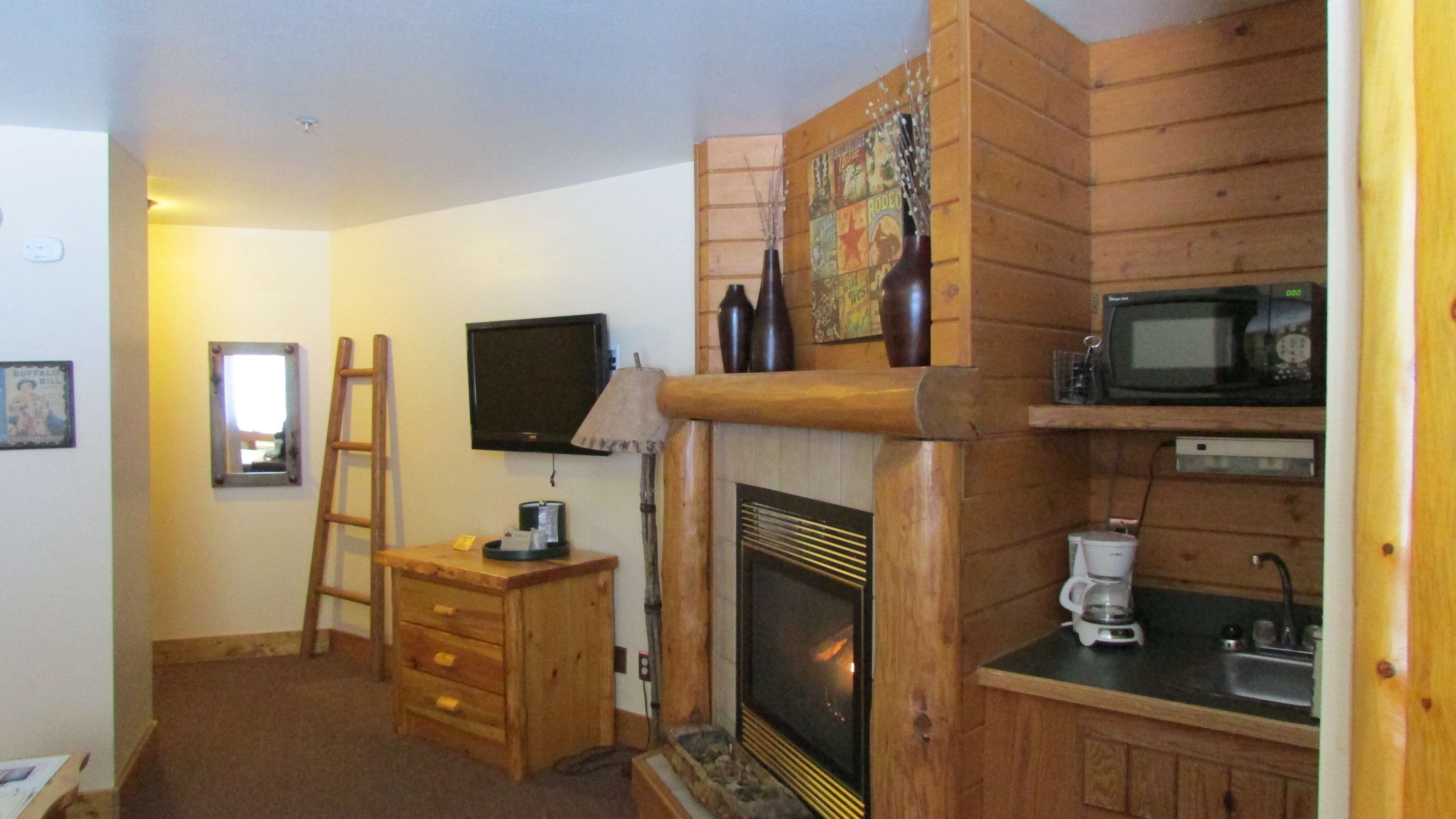 Quaint first-floor suite with a stunning creekside view! Enjoy the gas burning fireplace inside and the lovely view of Spearfish Creek right outside your window.